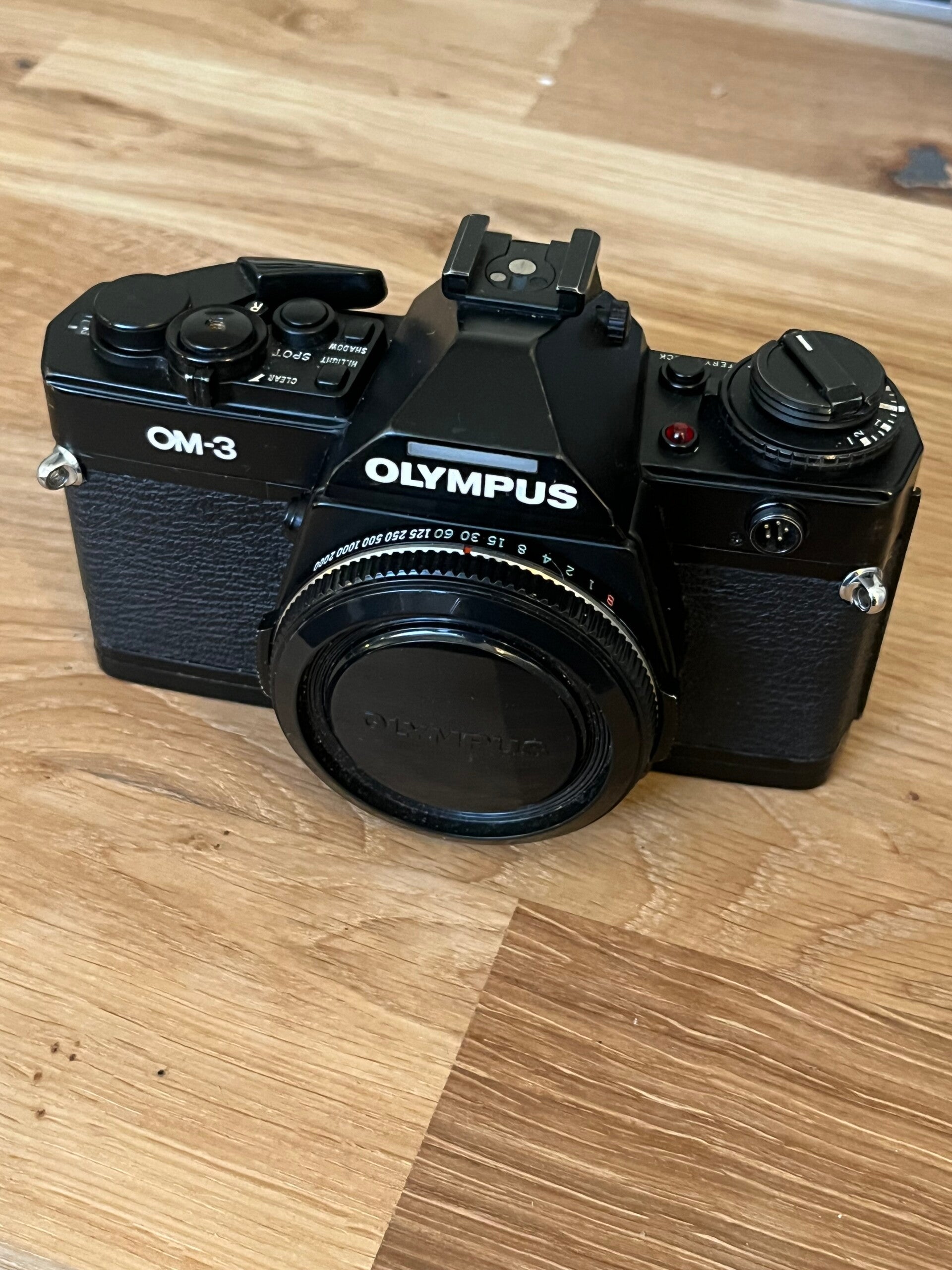Ovanliga Olympus OM-3 erbjuds här. OM-3 är en uppdaterad variant av den helt mekaniska OM-1. Mest krut har man lagt ner på ljusmätningen som har spotmätning och en rad andra mätfinesser. Även diopterjustering har man lagt till. Om man gillar OM-1 ska man allvarligt fundera på denna, vanliga SR44-batterier tar den istället för de gamla PX625. Kameran är i ett mycket bra fungerande skick. Filmtestad. Kommer med kanerahuslock.