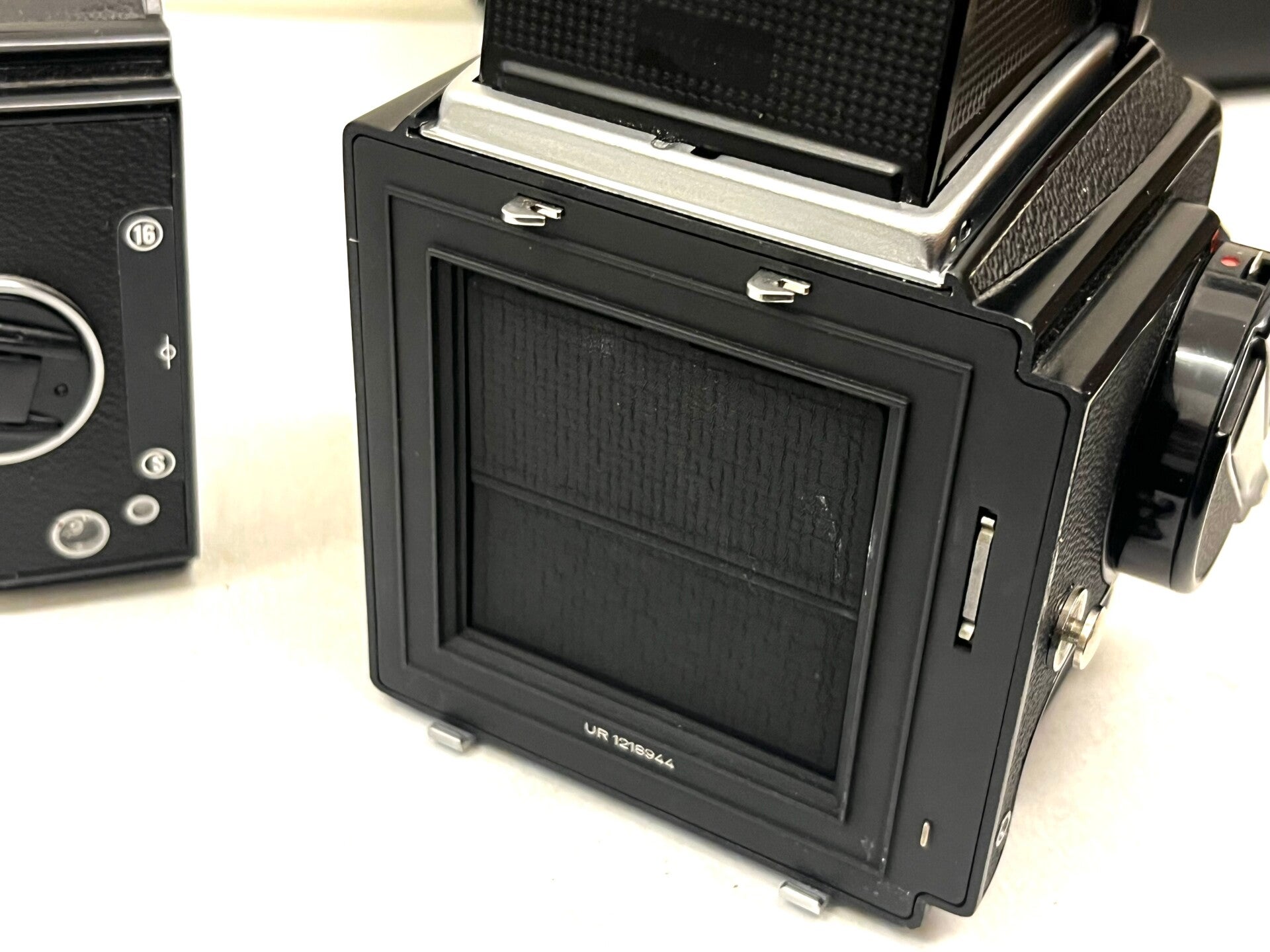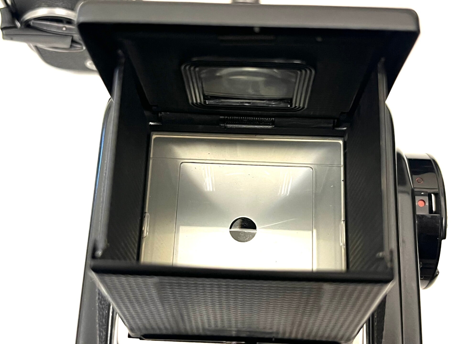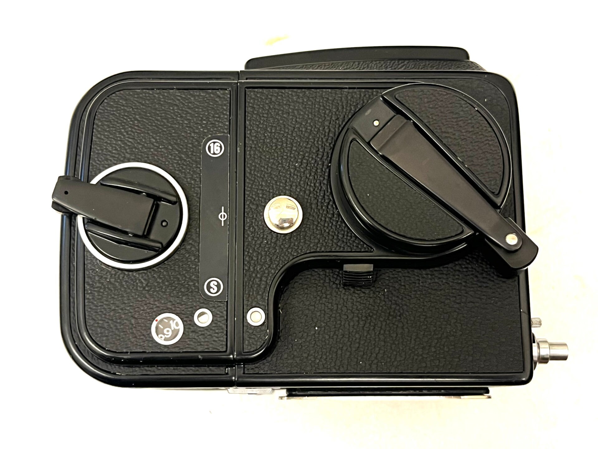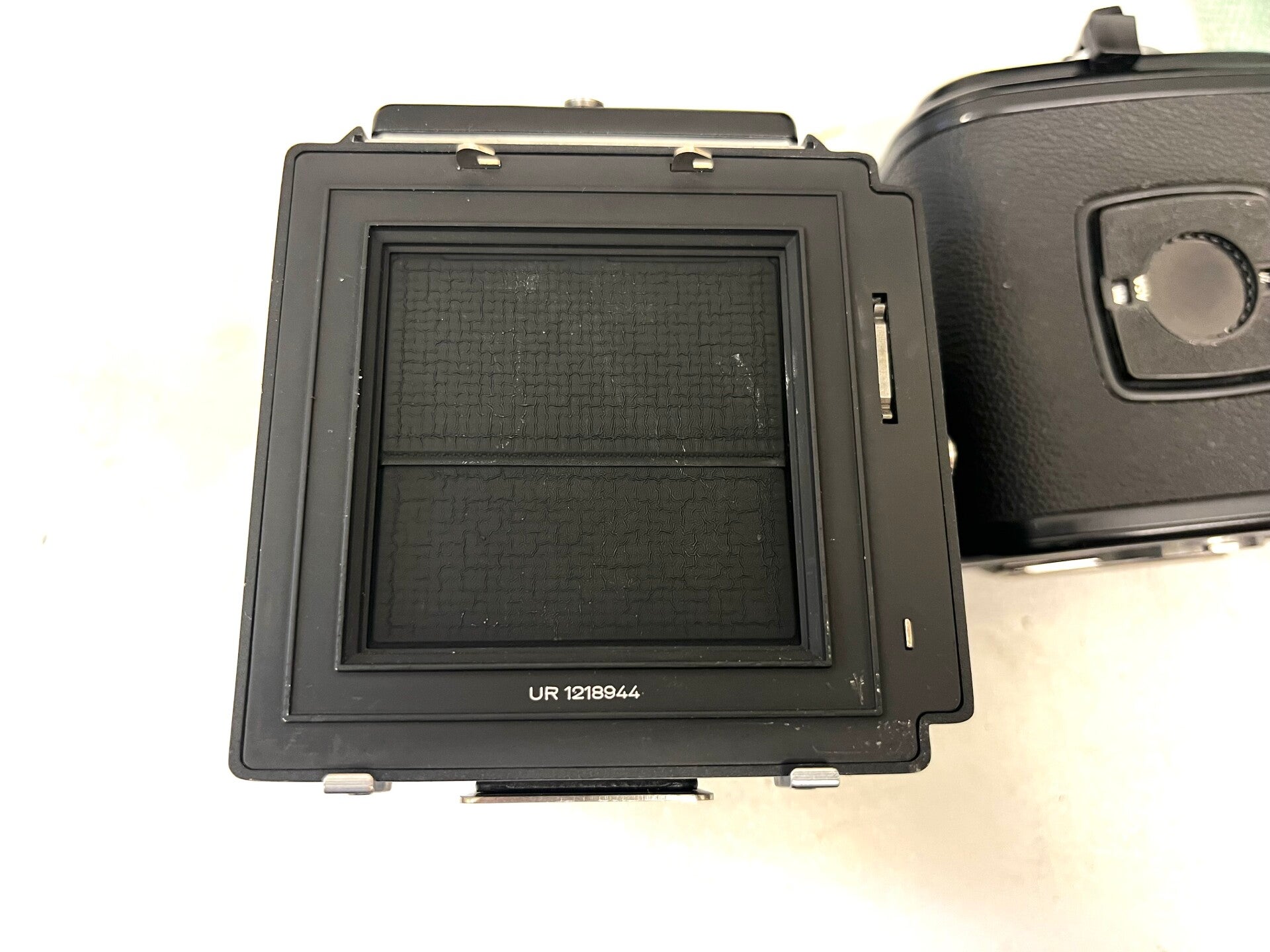 Perfekt fungerande skick. Nyservade enheter. Ovanliga A16s magasinet dvs 4x4 bildformat. Men får alltså 16 kvadrater istället för 12. Dark slide perfekt. Med maskramen till sökaren. Sökare och mattskiva också i ett bra skick, en liten repa i mattskivan bara. Split prism. Ljusstark rackare, kan det vara en Acute Matte? Vet ej.